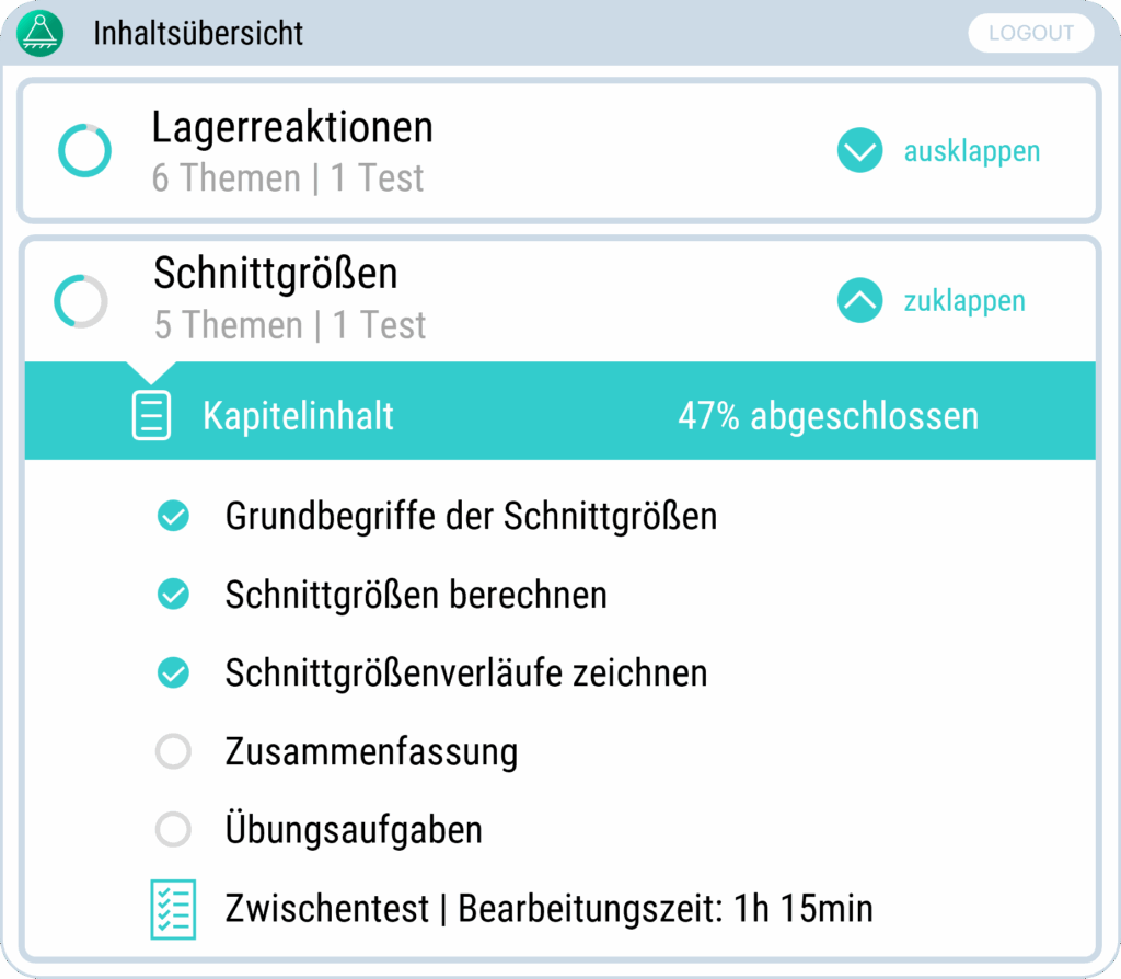 Der TM1 Onlinekurs bietet zu jedem Kapitel einen eigenen Zwischentest, mit dem du deinen Zwischenstand unter Zeitdruck testen kannst. Außerdem hast du am Ende eine abschließende Klausur zur Verfügung, um dein Wissen final zu prüfen. Deine Antworten werden automatisch ausgewertet und du hast Einsicht in die Lösungshinweise. Die Tests und Klausuren setzen sich zusammen aus Kurzfragen (Theorie) und großen Rechenaufgaben.